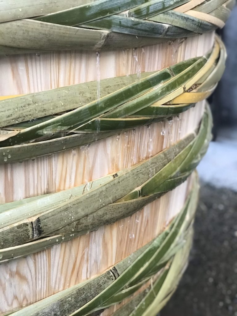 木桶を固定するタガも手作りです、編むのはとても難しい!
