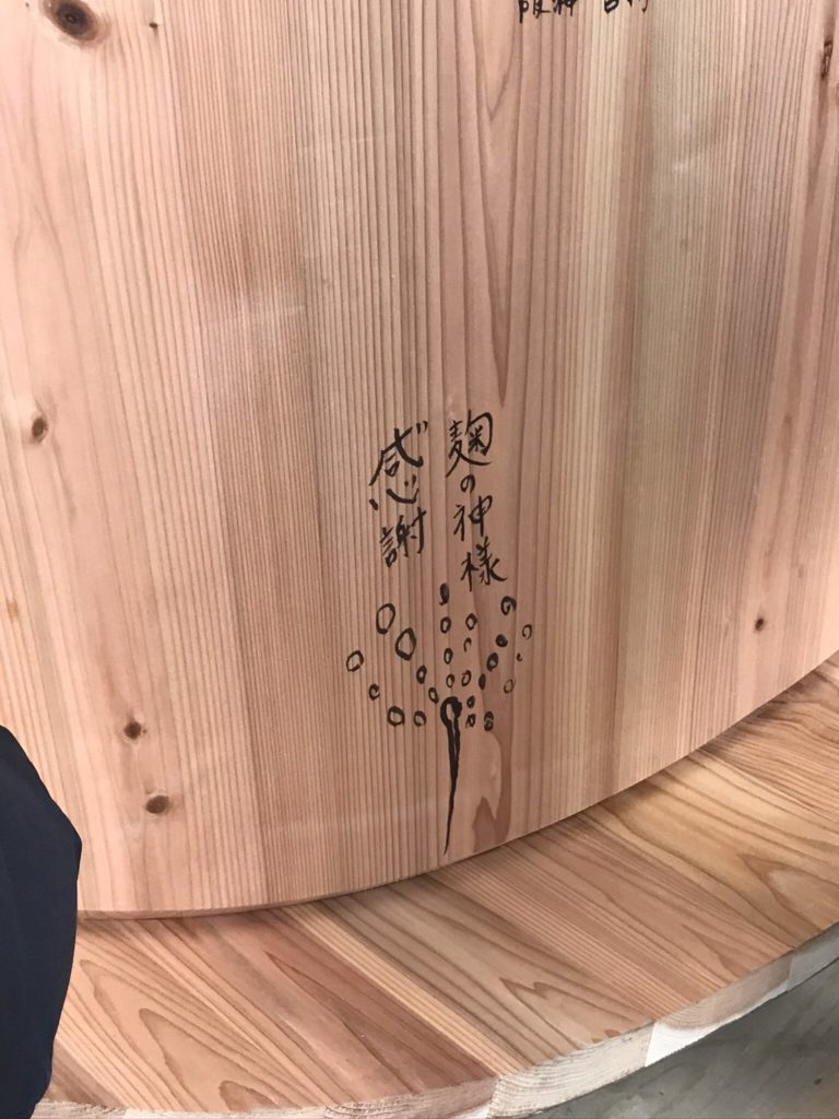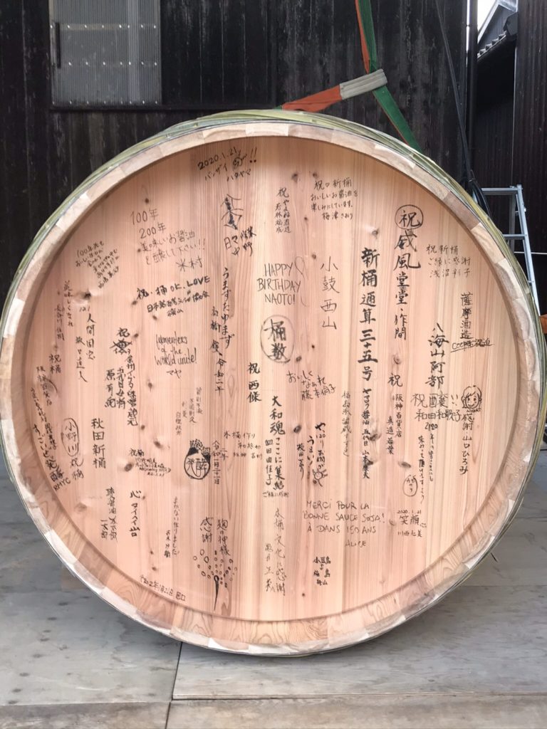木桶が完成!現場にいた参加者皆で筆入れ 私はこちらです。麹の神様ありがとう!