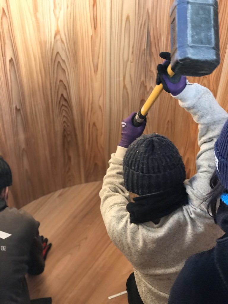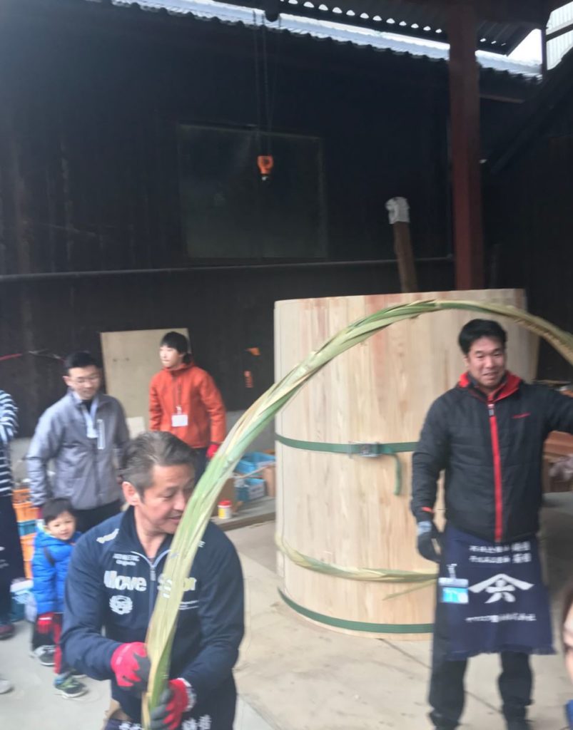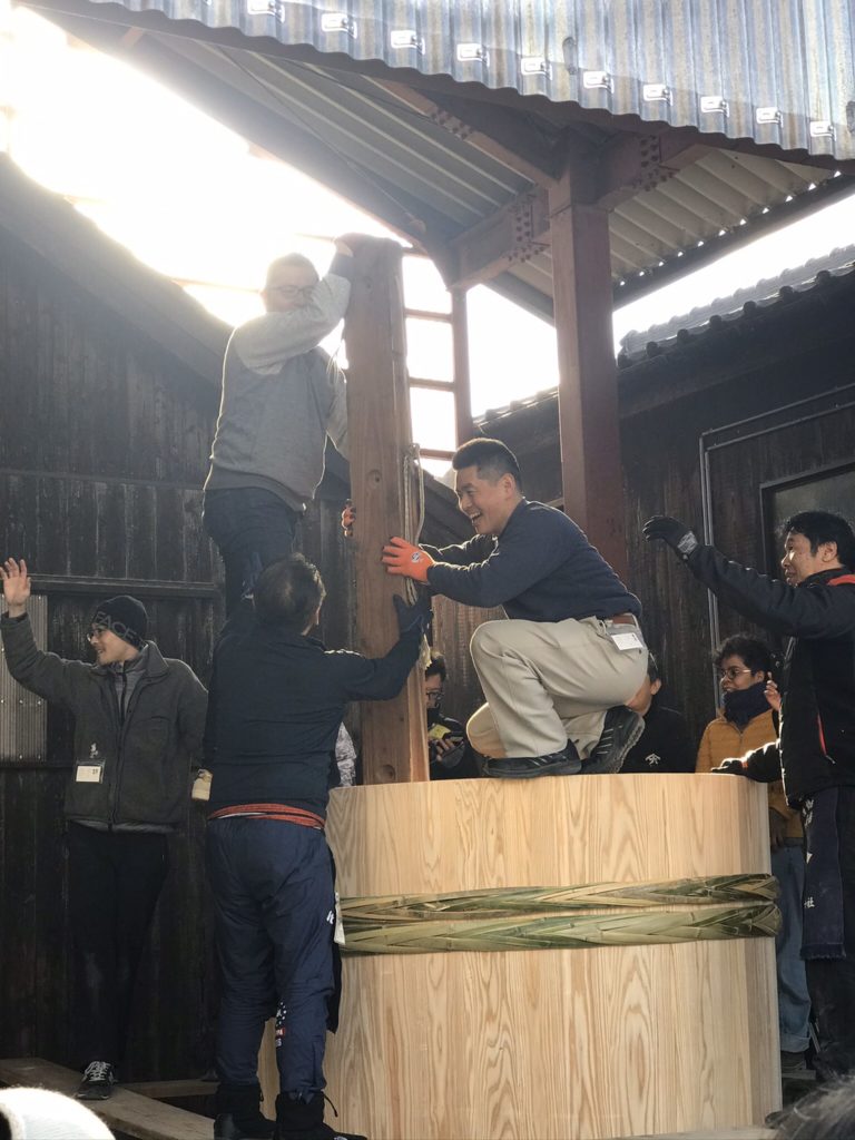 寒い中結構皆さん薄着で声を掛け合って楽しそうに作業が進んでいます。こんな活気のある雰囲気の中できた木桶には元気な微生物が沢山やってくるに違いないですね。