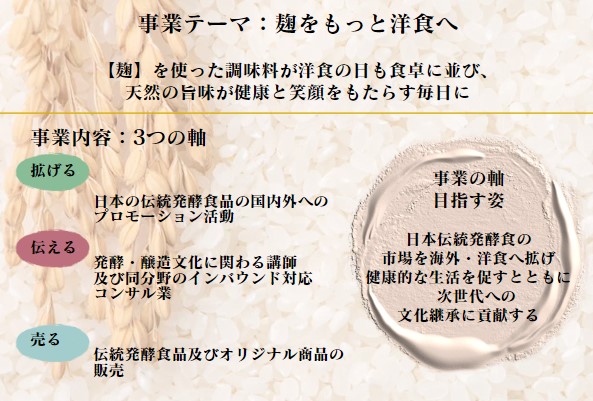 | 事業 | ・日本の伝統発酵食品の国内外へのプロモーション活動 ・発酵、醸造文化に関わる講師、及び同分野でのインバウンド対応コンサル業 ・伝統発酵食品、及びオリジナル食品の販売 |