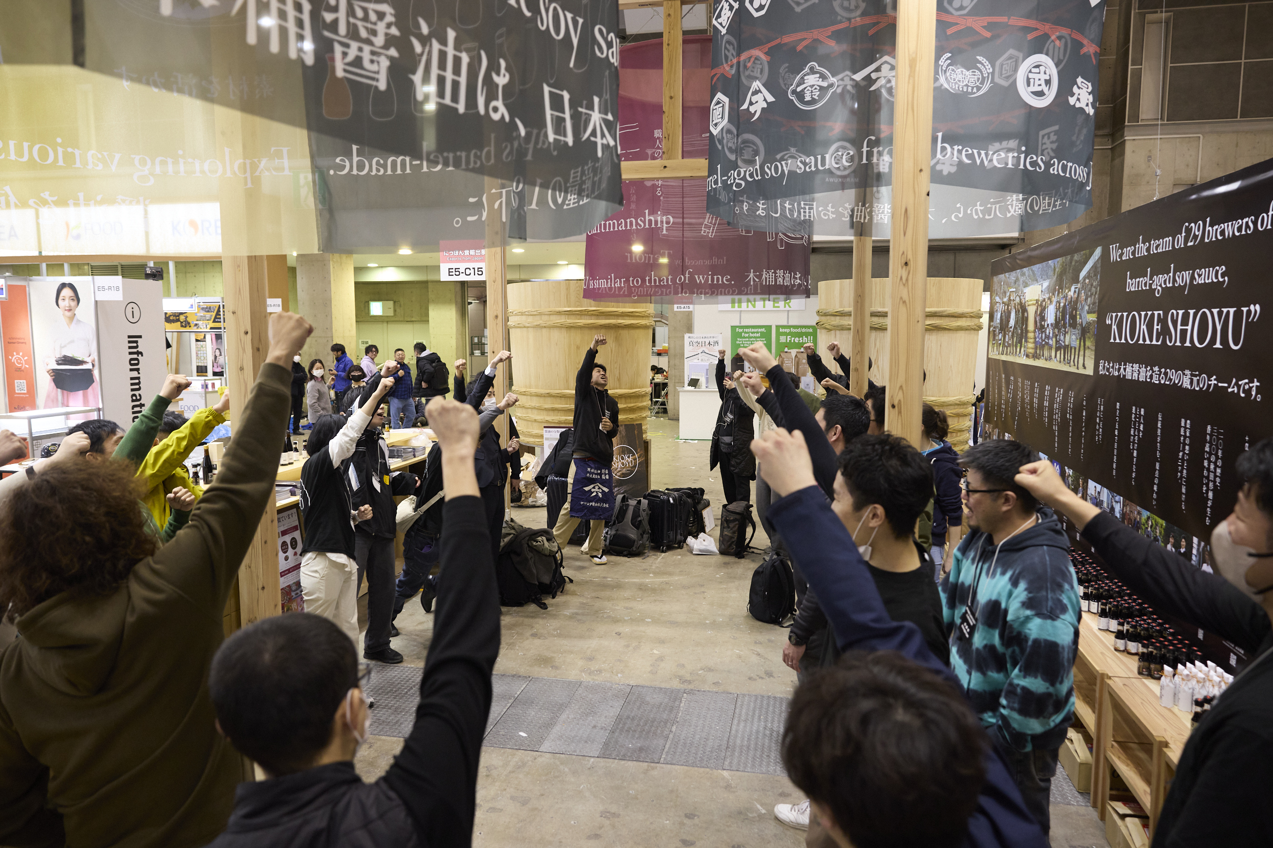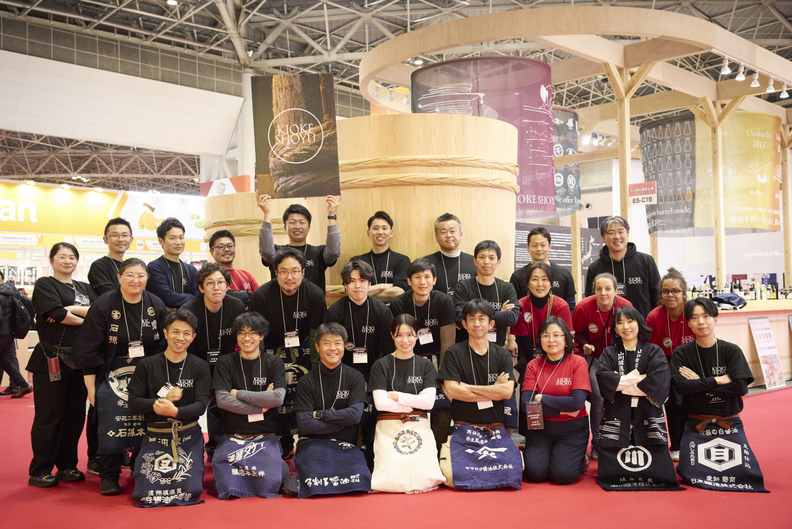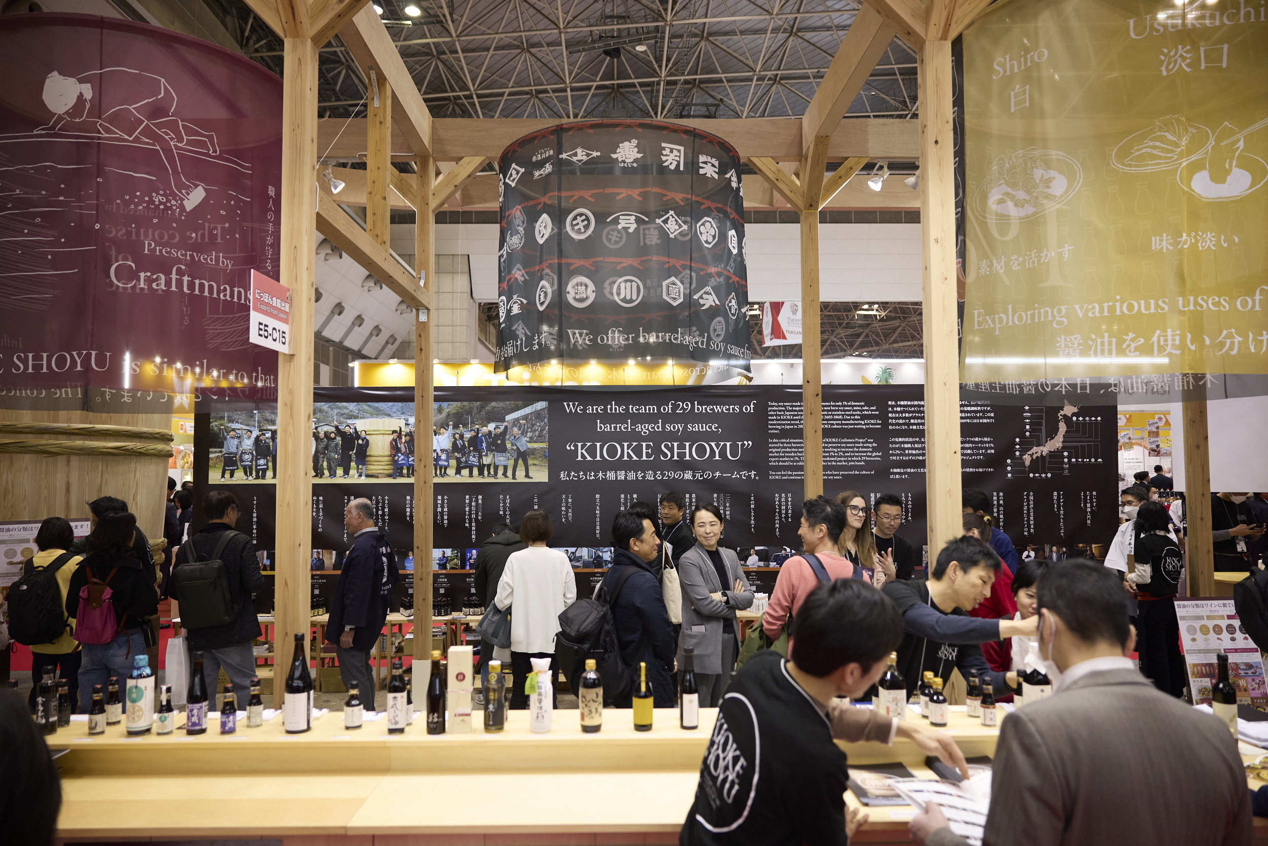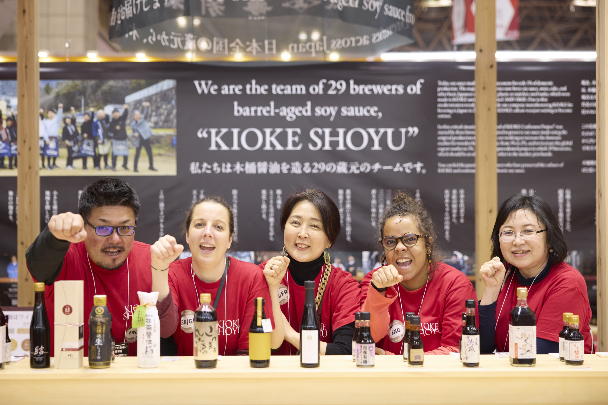 ブースの奥の壁には、我々は木桶醤油を作る29の醤油蔵のチームです!と書かれています。