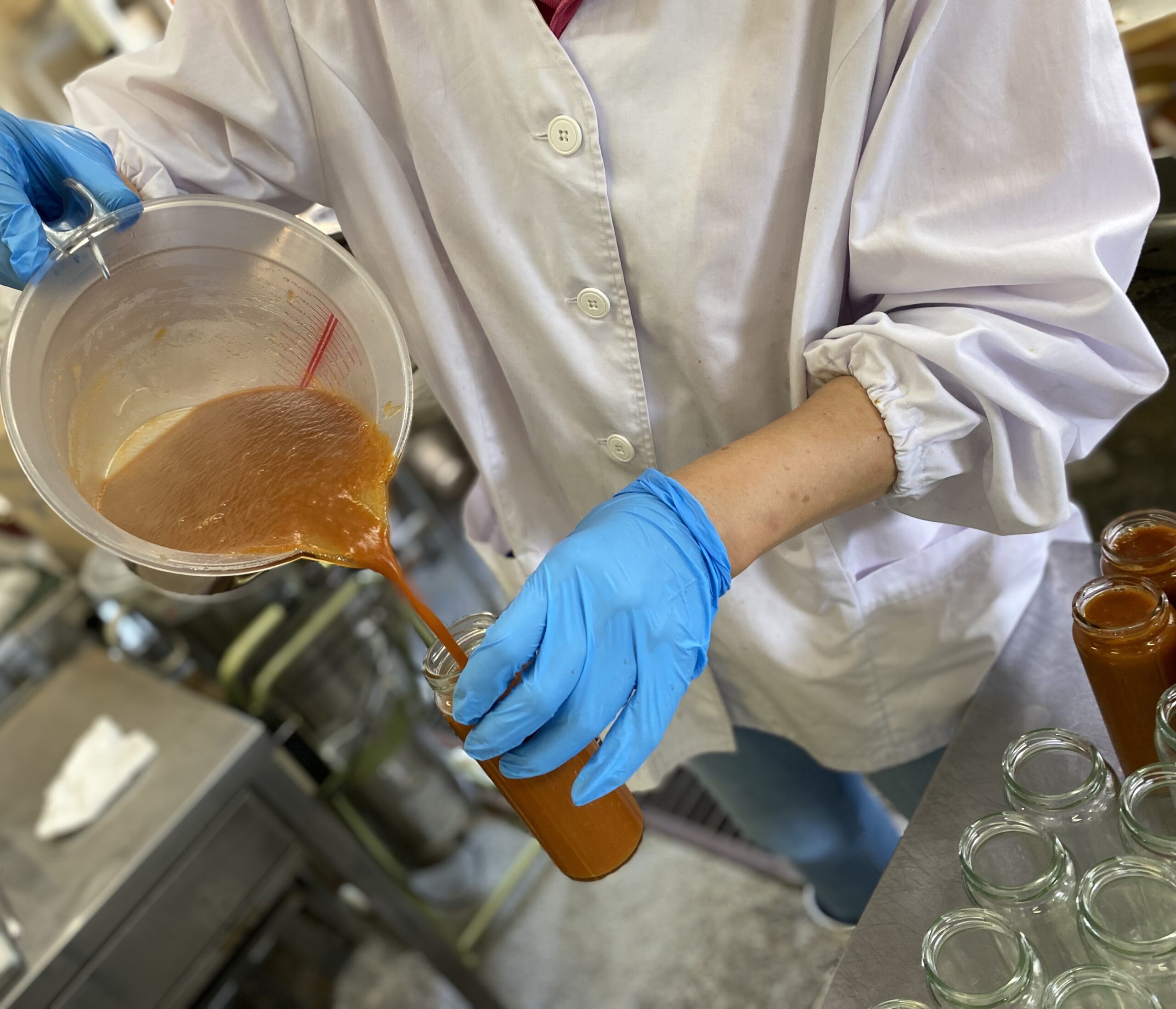 熱いうちに手際よくちゃっちゃと瓶に埋めていき、重さもきちんとチェックします。これが、ほんっとに凄いの、一滴も落とさないし、瓶の周りにも決して漏らさない正確さ。私が横でじーっと見ててとてもやりづらいだろうなと思ったのに全くぶれない彼女、素晴らしかった。一連の作業が終わった後感動してたら「慣れですね~」と笑っていうけれど、右のピッチャーはかなり重いはず。これを150本、休憩無で手作業充填。華奢に見えるエプロンの下の右腕の筋肉は実はもっりもりに違いない。
