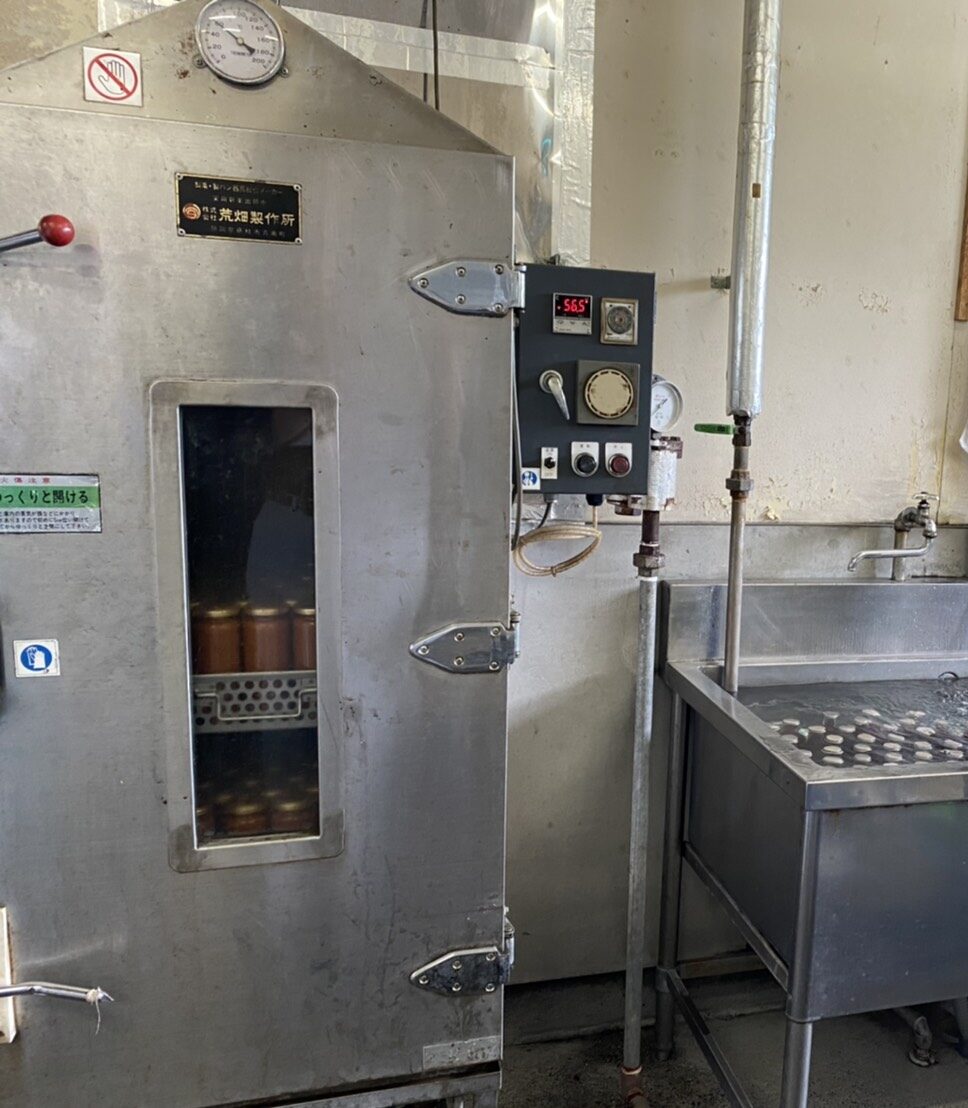 保存料を使用しないことをモットーとし、この機械に入れ、90℃30分以上の加熱殺菌を行っていきます。