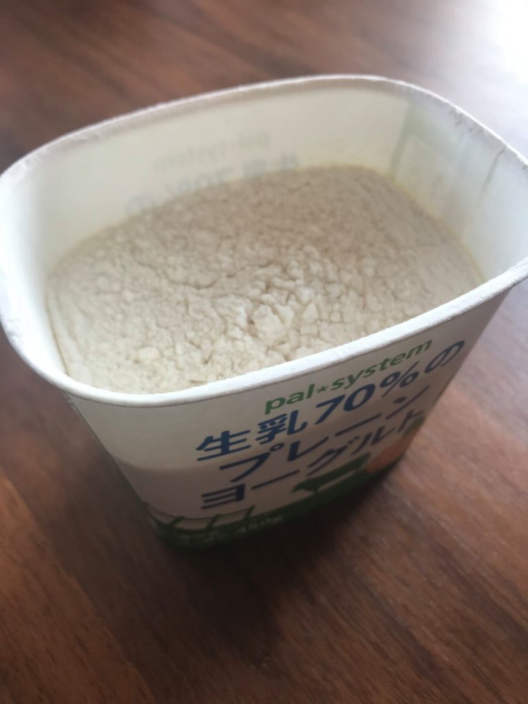 *写真のようにヨーグルトを空けた後に小麦粉を入れて分量を量ります