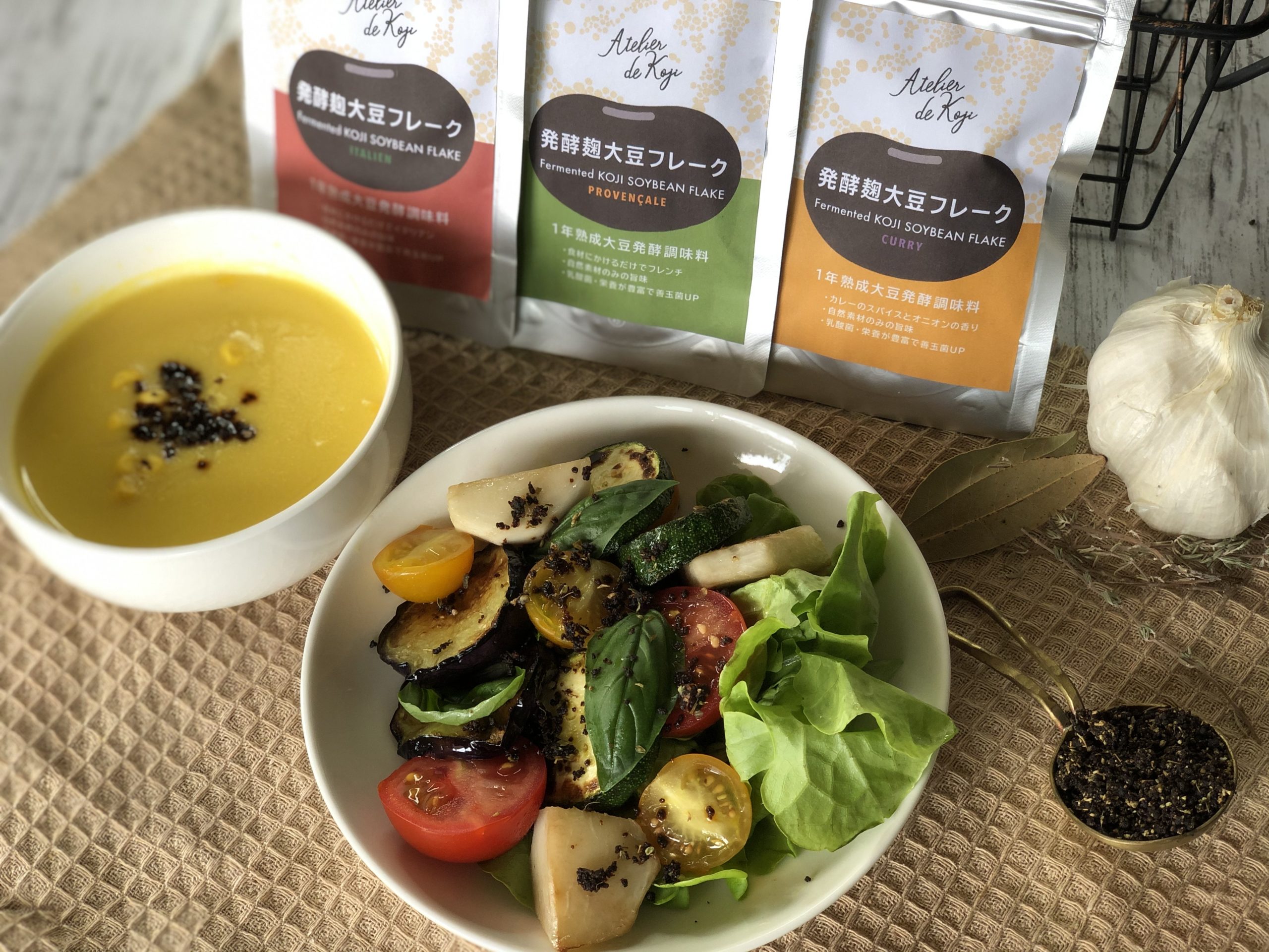 開発した商品はその後で、静岡県浜松の名産品、浜納豆を使った発酵麹大豆フレーク3種(プロバンス・イタリアン・カレー)、白みそを使った塩麴ソイマヨ、まるやさんの有機八丁味噌を使った八丁味噌グレイビーと続いていきます。素晴らしい出会いに恵まれ、頂いたご縁の結果生まれた商品でありました。