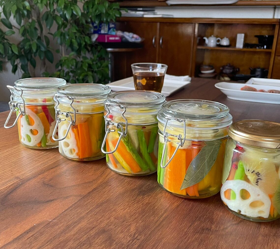 ピクルス作りでは、瓶の側面を野菜で可愛くアレンジして、撮影会!